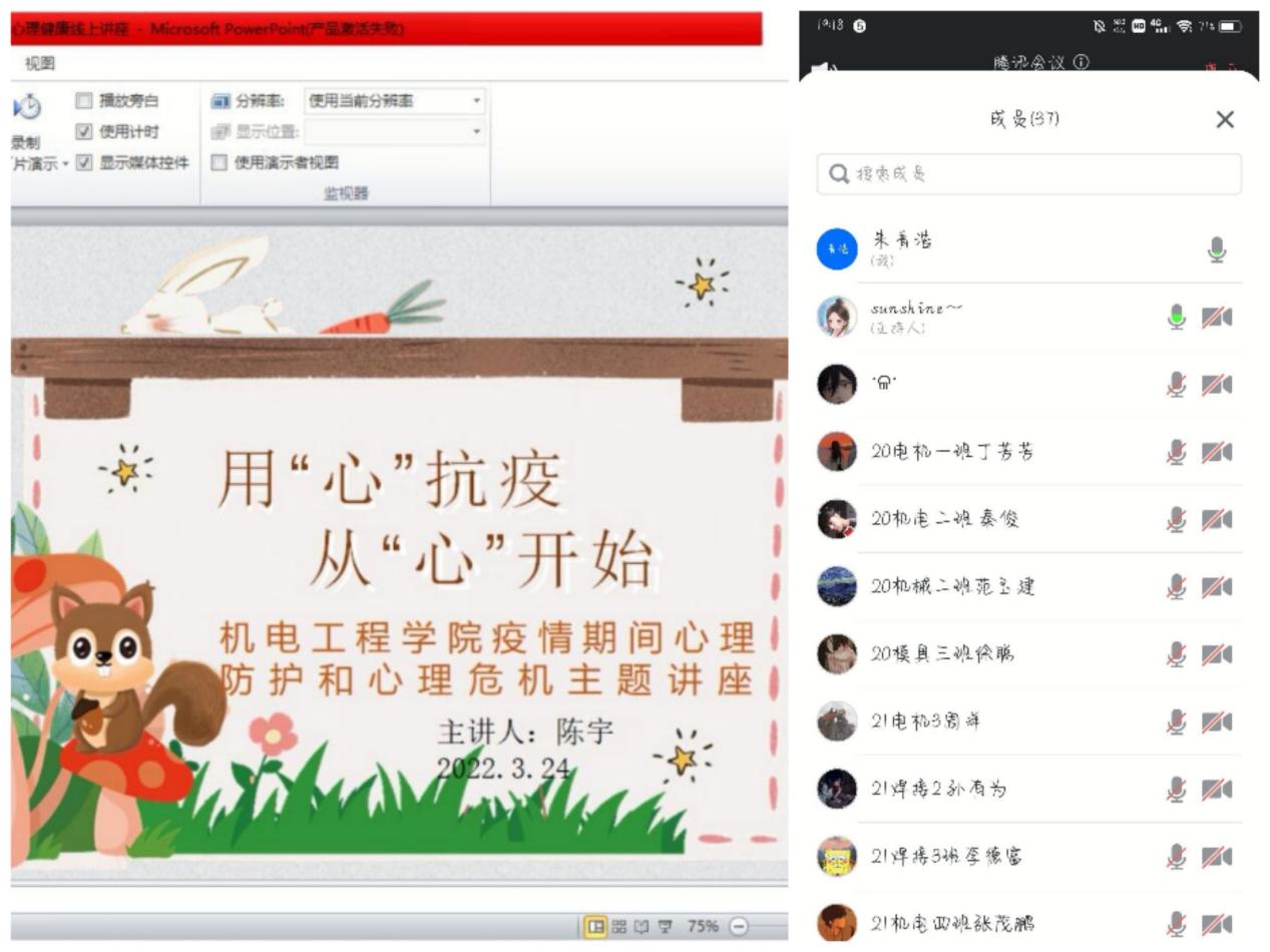 为疏导老员工在疫情封校时期导致的心理压力,3月24日18:30,谈球吧陈宇老师通过腾讯会议,为2020、2021级各班心理委员召开“用‘心’抗疫,从‘心’开始”疫情期间心理防护与心理危机线上培训讲座,通过讲座学会自我调节方法,增强心理免疫力,进而帮助更多需要帮助的同学。