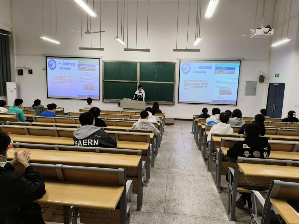 本次会议刘风顺同学主要向各位22级信息员介绍了信息员的职责和评奖评优工作,并向各位信息员解释了信息员与其他班干的职责区别,详细地说明了机电分中心的信息员们应当完成的工作:定期填写评教信息、每天的教学自查工作、学习教学评教新闻、每个学期的工作计划和工作总结以及听课记录登记存档等。同时刘风顺同学也强调了信息员的评奖评优的要求和细则,在会议快结束时刘风顺同学希望每位信息员能够重视并做好自己的工作,并感谢大家自开学以来积极配合和信息反馈,鼓励大家认真履行职责并积极参加信息员评优。刘风顺同学发言结束后代淑雅同学上台补充了信息员的工作细则和工作安排。