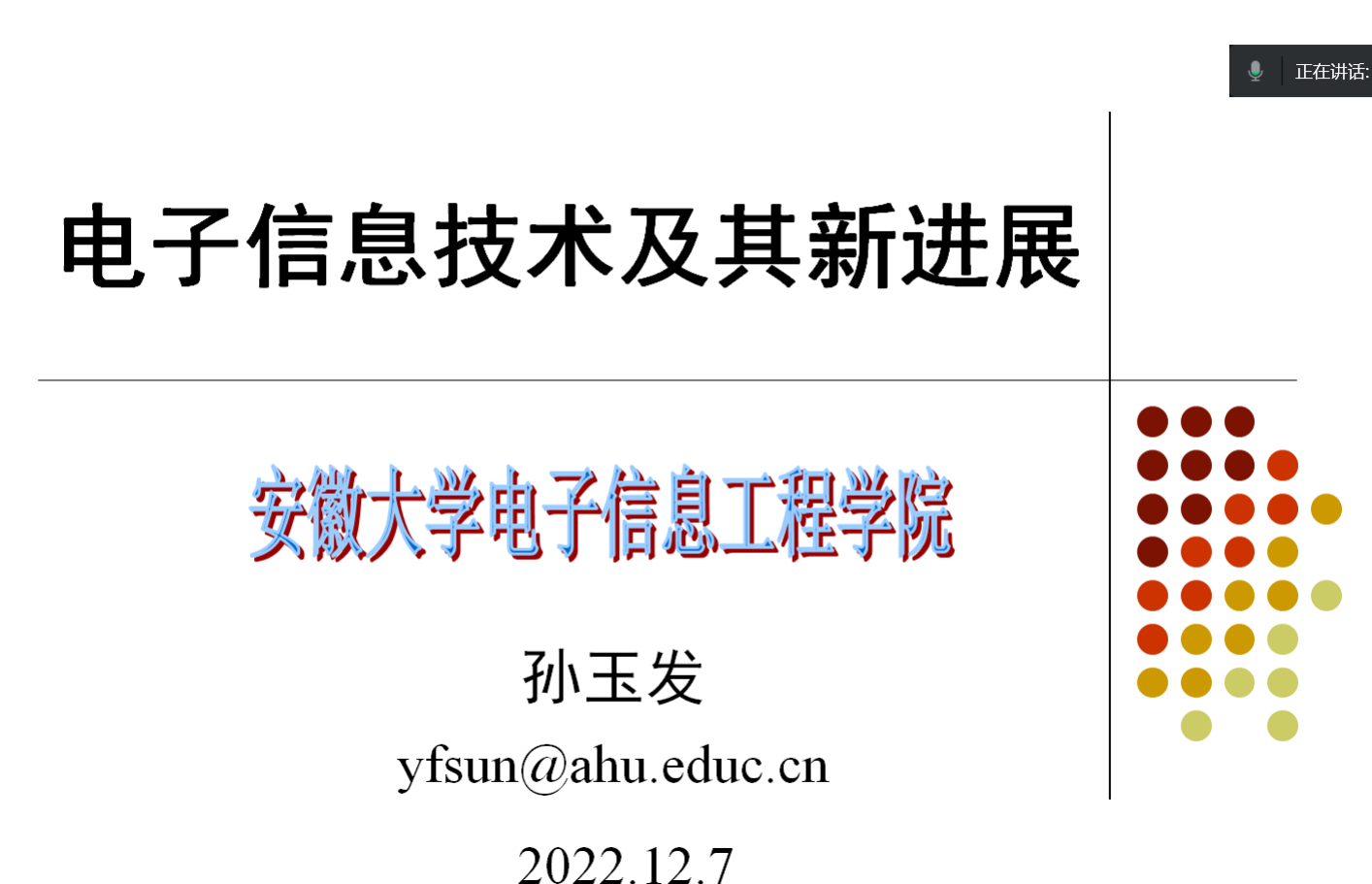 为使公司师生了解电子信息技术及其新进展相关知识,12月7日19:00-20:00,公司开展了“电子信息技术及其新进展”学术讲座,此次学术讲座主讲人为安徽大学电子信息工程公司教授、博士生导师孙玉发,谈球吧老师及员工通过腾讯会议的线上方式参加了此次讲座。