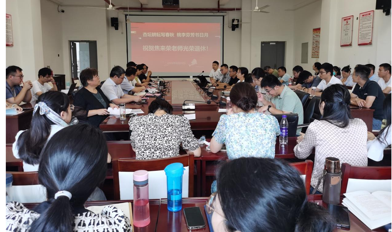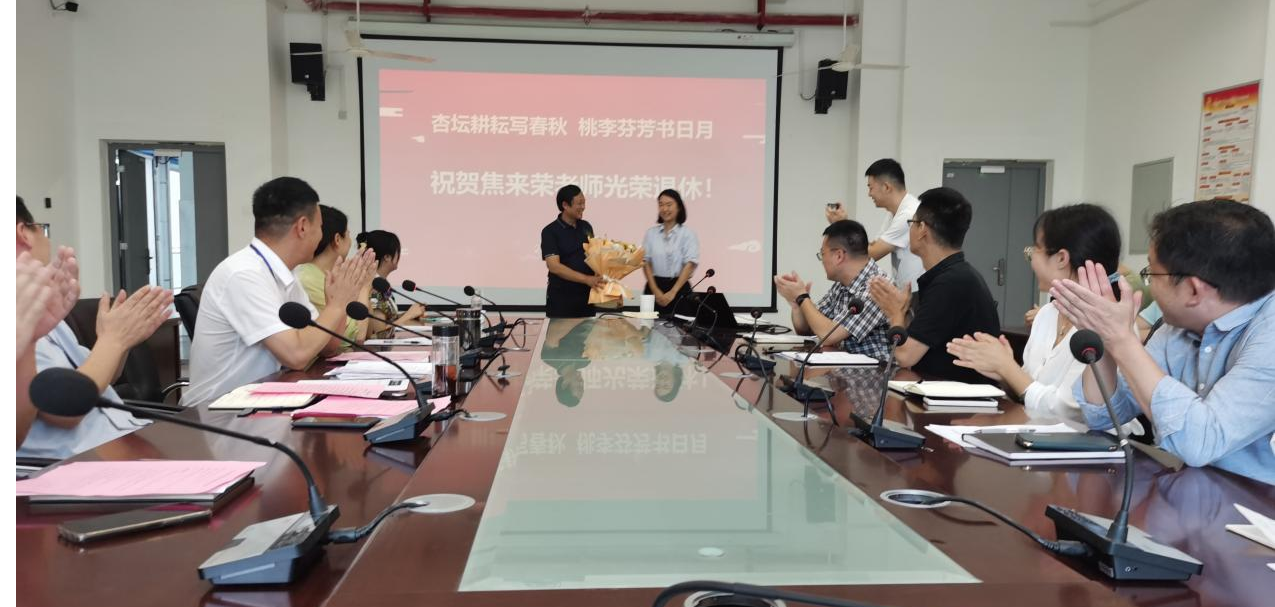 8月29日上午,谈球吧全体教职工在机电楼二楼会议室举行焦来荣老师光荣退休欢送会。